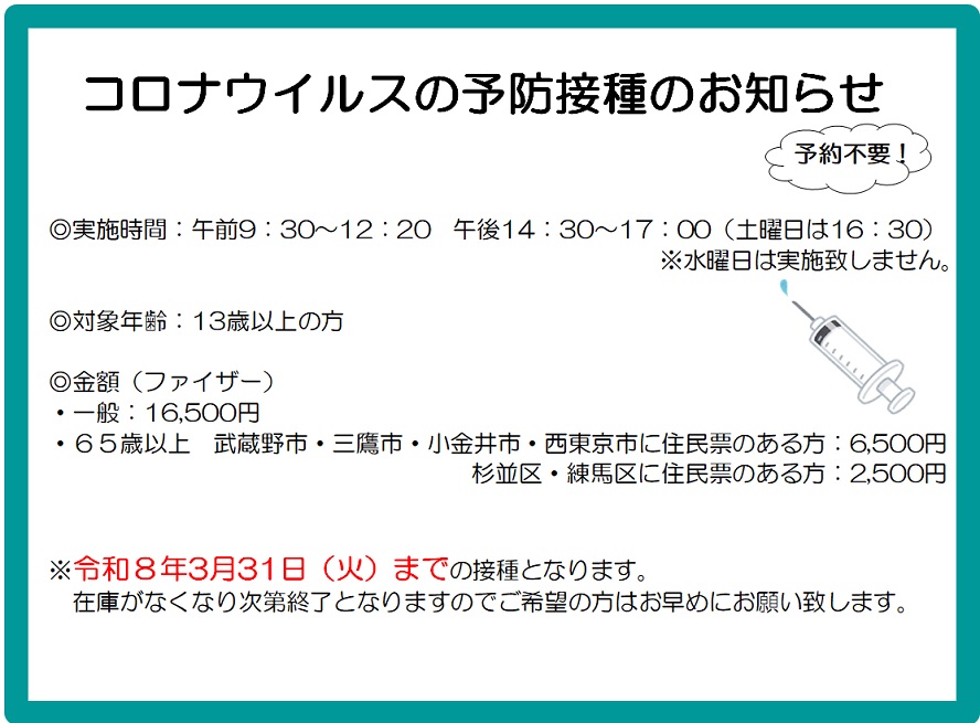| 2026.01.13 | 武蔵野市帯状疱疹ワクチンのお知らせ(予約制) |