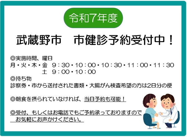 武蔵野市市民健診につきまして、ご希望される当日に、健診可能な場合もありますので、当日に、武蔵野市市民健診ご希望の方は、お問い合わせくださいますよう、お願い申し上げます。