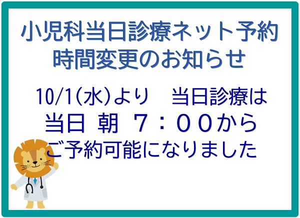 【10/1~】小児科 当日診療ネット予約 時間変更のお知らせ