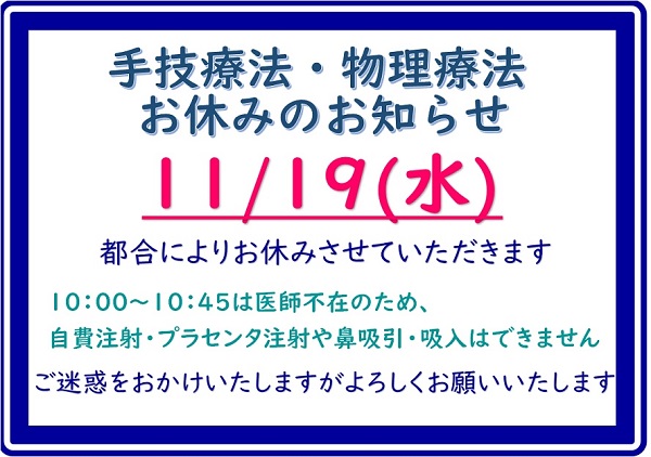 11月19日(水) 手技療法・物理療法 お休みのお知らせ