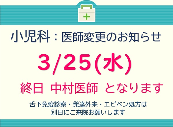 小児科 3/25(水)医師変更のお知らせ