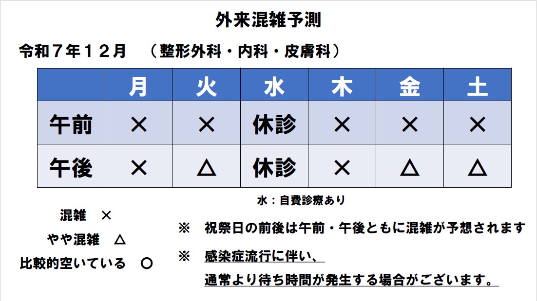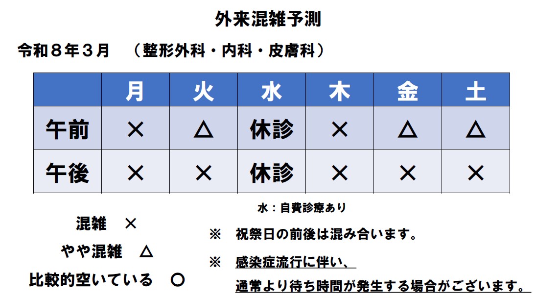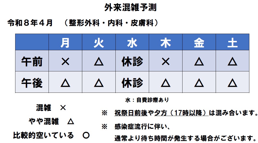 整形外科・内科・皮膚科診療の混雑状況の目安は、以下の表となります